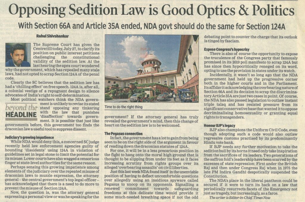 Read MoreOpposing Sedition Law is Good Optics & Politics: With Section 66A and Article 35A ended, NDA govt should do the same for Section 124A