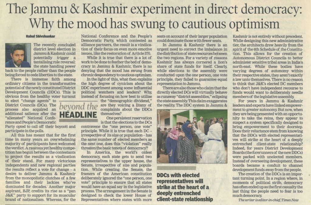 The recently concluded district level election in Jammu & Kashmir could potentially trigger a tantalising role reversal: the state handing power back to the people rather than the people being forced to cede liberties to the state. There is immense faith among ordinary citizens in the transformative potential of the newly constituted District Development Councils […]