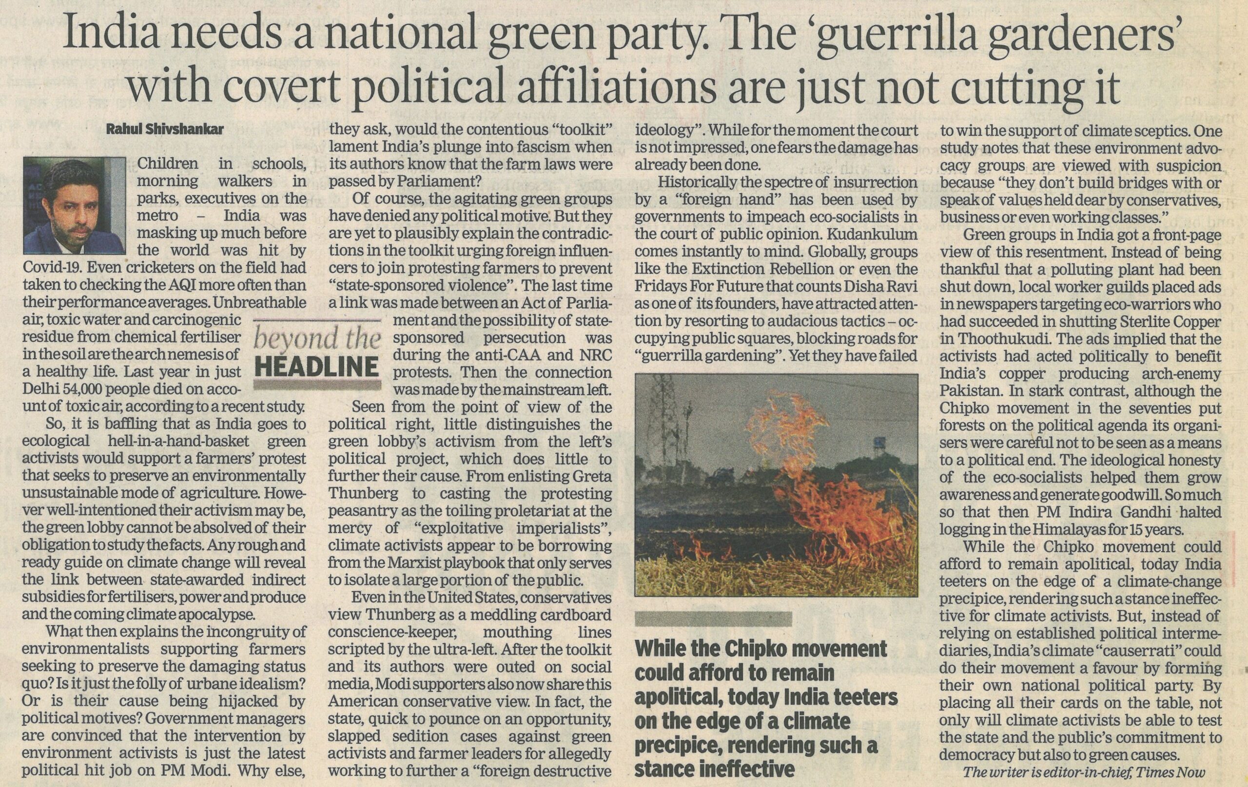 What then explains the incongruity of environmentalists supporting farmers seeking to preserve the damaging status quo? Is it just the folly of urbane idealism? Or is their cause being hijacked by political motives? Government managers are convinced that the intervention by environment activists is just the latest political hit job on PM Modi. Why else, they ask, would the contentious “toolkit” lament India’s plunge into fascism when its authors know that the farm laws were passed by Parliament?